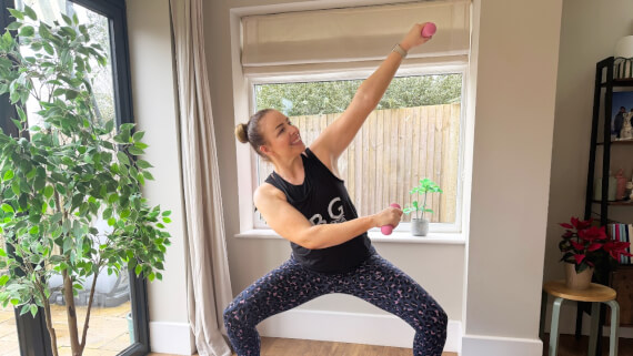 Small weights and pilates blend to create this standing all body workout.