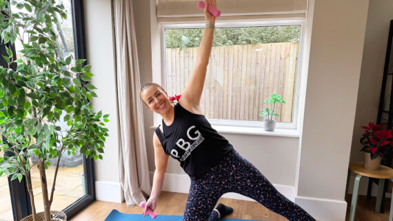 A vibrant waist focused small weights pilates class designed to sculpt and tone.
